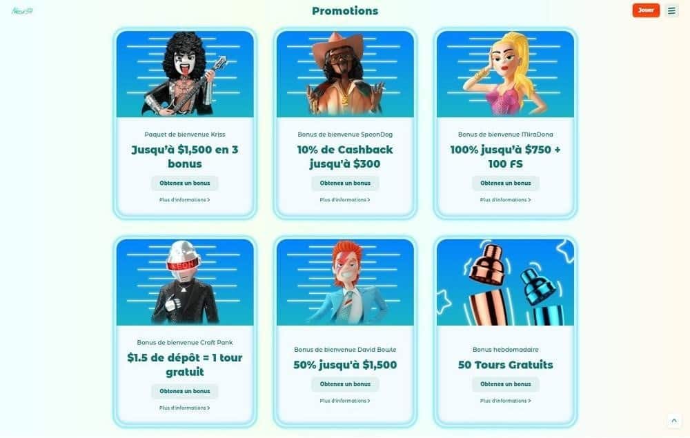 Neon54 propose une expérience de jeu décalée avec son thème original. Le site web joue notamment sur des tons clairs avec beaucoup de couleurs et des néons pour immerger le joueur. Depuis le menu, il vous accueille avec 5 avatars légendaires, qui représentent les plus grands noms de l’industrie de la musique. Ceux-ci sont animés et héritent d’une finition graphique exceptionnelle.